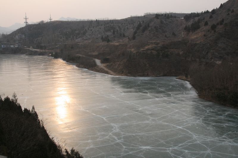 À la fin du parcours, nous trouvons un lac complètement gelé, mais n’osons pas marcher dessus car des craquements inquiétants parcourent le lieu par moment ; ce qui n’a pas l’air d’inquiéter plus que cela le Chinois qui pêche tranquillement au bord, à l’interface entre la partie gelée et la partie non gelée.