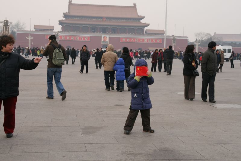 L’entrée de la cité interdite donne sur la place Tiananmen. Pour ceux qui aiment le morbide, on peut aller voir la dépouille conservée de Mao 😯 (pas notre truc). La place est bien gardée : 4 caméras sur chaque lampadaire, contrôle des bagages à l’entrée et des soldats ou policiers dispersés un peu partout. Nous passons vite notre chemin car il n’y a rien à voir.
