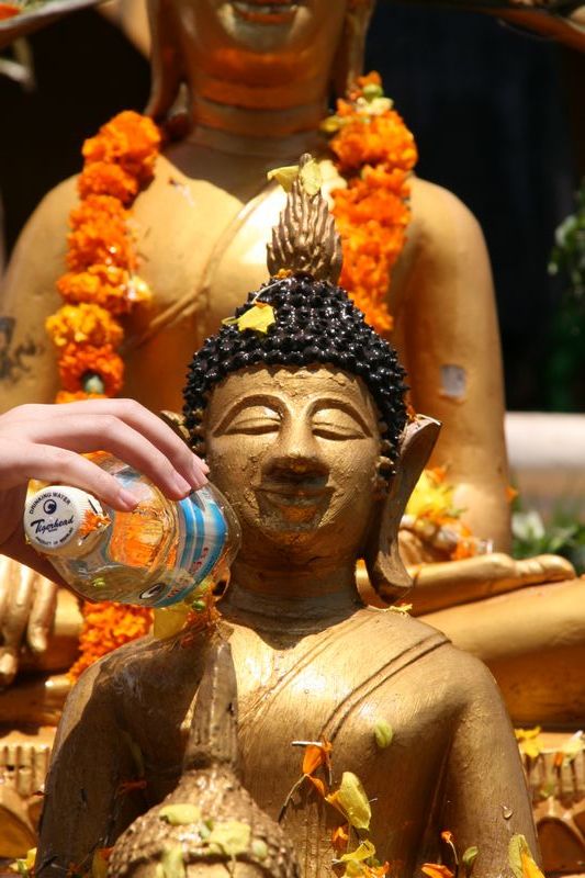 Les Laotiens vont de temple en temple pour arroser les statues de Bouddha. Nous voyons même des petits arroser les statues avec des pistolets à eau.