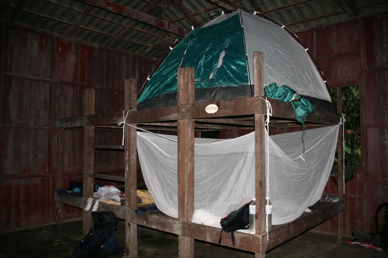 Nous sommes finalement bien contents d’avoir la tente comme moustiquaire, avec les rats sur les poutrelles et les lits, les grosses guêpes et autres insectes à l’intérieur de l’abri. On trouve des sangsues jusque sur le sol de l’abri.