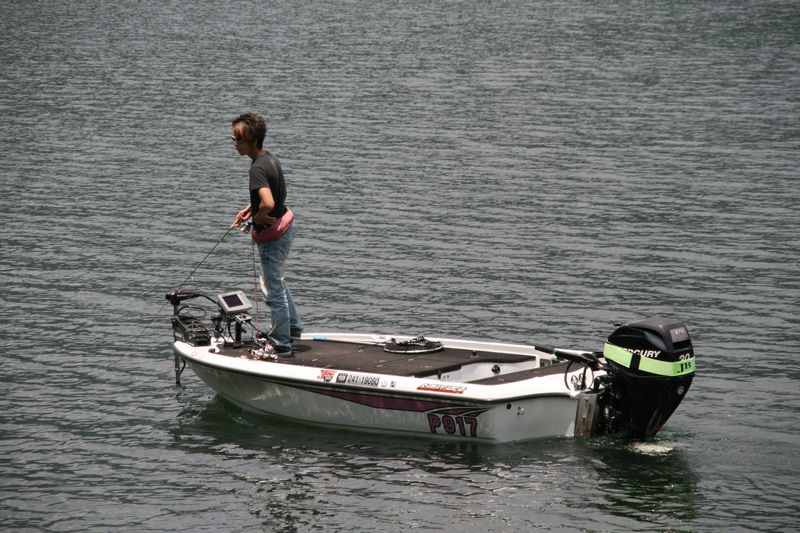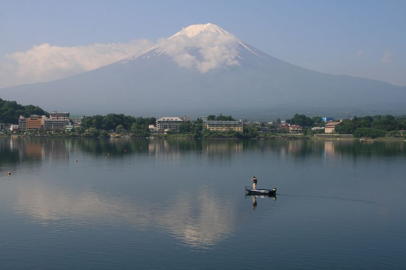Sur le lac, des Japonais pêchent sur des barques bardées d’électronique (sonar, moteur électrique, pilotage automatique). Il faut au moins cela pour attraper les poissons que nous avons vu être déversés par camion au petit matin 😉 !
