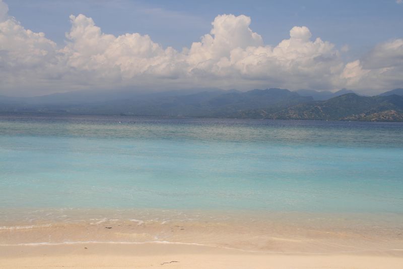Après 1h revigorante de speed boat (l’étanchéité du toit laissant un peu à désirer), nous arrivons à bon port : débarquement direct dans les eaux transparentes d’une plage de sable blanc. L’archipel des Gili compte trois îles et nous logeons sur la plus populaire, Gili Trawangan.