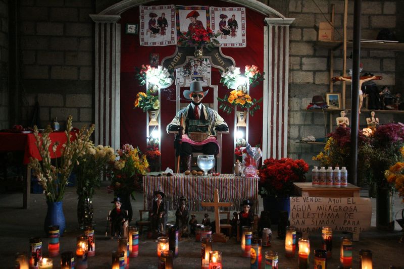 Près de Quetzaltenango dans l’ouest du Guatemala, nous faisons une drôle de halte pour nous recueillir auprès de l’effigie d’un dieu Maya nommé San Simon.