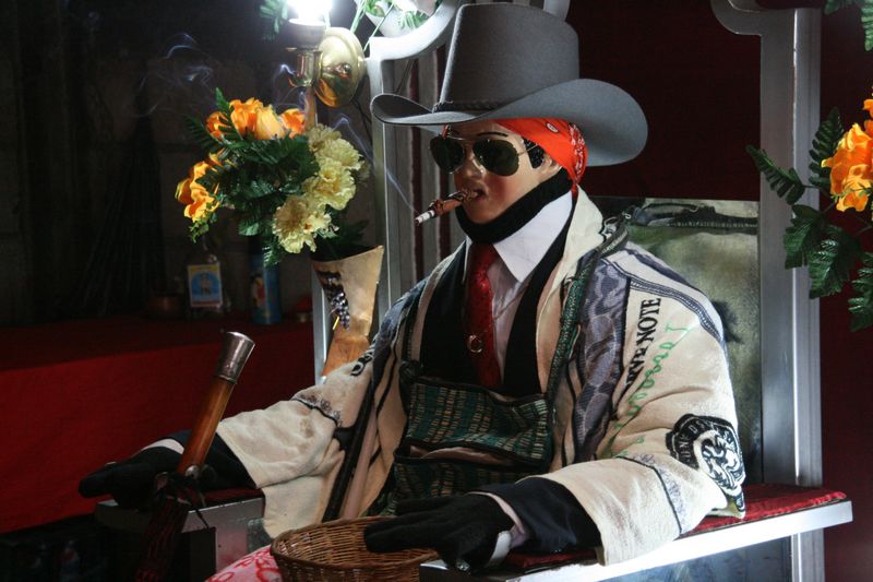 La statue est entreposée dans une sorte de hangar à la décoration indescriptible. Un mannequin, croisement entre Mickael Jackson (paix à son âme) et un maquereau, trône au milieu de la pièce 😯 . Il fume clope sur clope, chacune allumée par ses dévoués serviteurs. Différentes offrandes peuvent lui être offertes, mais sachez qu’il aime particulièrement l’eau de vie, les cigarettes et l’argent.