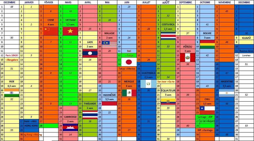 Cela commence par l’Inde et finit par l’Argentine. 21 Pays en tout ! Une dizaine de vols ! Des liaisons entre les pays par tous les moyens imaginables (dos d’éléphants, lamas , trains , bus , bateaux …)