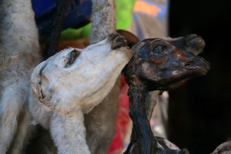 Lors de notre balade au marché aux sorcières, nous observons une étrange coutume : la vente de fœtus de lamas séchés 😯 . En effet, les habitants les enterrent sous les fondations de leur maison comme porte-bonheur.