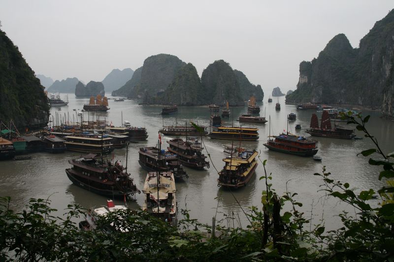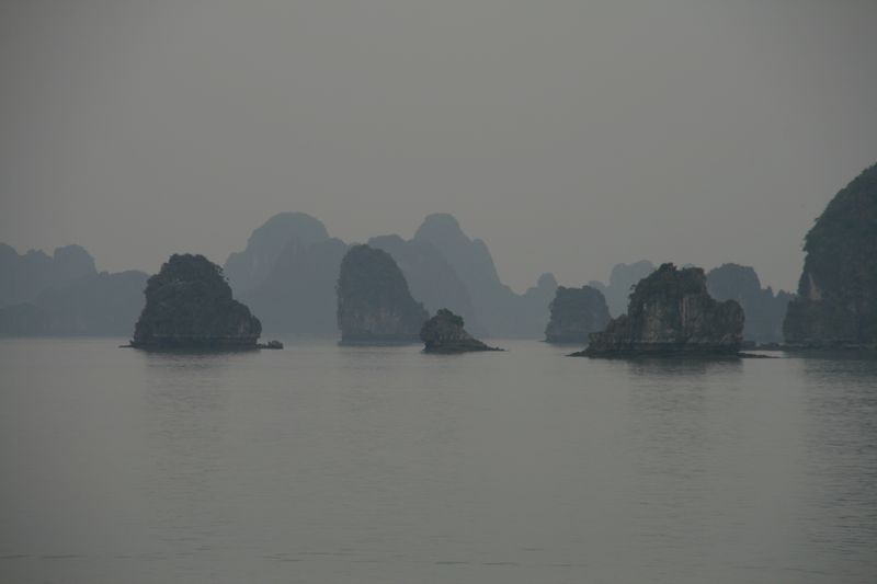 Halong, c’est le paysage de Yangshuo en Chine mais dans l’océan : des pics calcaires formant de petites îles en pain de sucre à perte de vue. Le site est impressionnant par le nombre de ces formations géologiques (2000 îles environ). Dommage qu’il fasse mauvais, car avec du soleil cela doit être vraiment splendide.